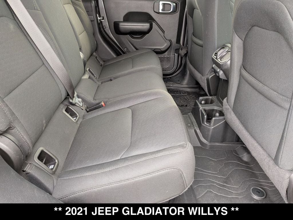 Gladiator Willys, 4D Crew Cab, 3.6L V6 24V VVT, 8-Speed Automatic, 4WD, Granite Crystal Metallic Clearcoat, Black Cloth, 110 mph Vehicle Max Speed Calibration, 240 Amp Alternator, 4-Wheel Drive Decal, 8 Speakers, 97 mph Maximum Speed Calibration, Anti-Spin Differential Rear Axle, Automatic Headlamps, Black 3-Piece Hard Top, Black Grille, Black Trail Rated Badge, Body Color Fender Flares (2-Piece), Brake assist, Bridgestone Brand Tires, Class IV Hitch Receiver, Cold Weather Group, Convenience Group, Daytime Running Lamp System, Deep Tint Sunscreen Windows, Electronic Stability Control, Freedom Panel Storage Bag, Front 1-Touch Down Power Windows, Front Bucket Seats, Front Heavy Duty Red Accent Shock Absorbers, Heated Front Seats, Heated Steering Wheel, Heavy-Duty Engine Cooling, Leather Wrapped Steering Wheel, Mold In Color Bumper w/Gloss Black, MOPAR All-Weather Floor Mats, MOPAR Spray In Bedliner, Outside temperature display, ParkView Rear Back-Up Camera, Power Heated Mirrors, Power Tailgate Lock, Protection Sill Rails, Quick Order Package 24W Willys, Radio: Uconnect 3 w/5 Display, Rear Heavy Duty Red Accent Shock Absorbers, Rear Sliding Window, Rear Window Defroster, Remote Keyless Entry, Security Alarm, Speed Sensitive Power Locks, Steering wheel mounted audio controls, Sun Visors w/Illuminated Vanity Mirrors, Telescoping steering wheel, Tilt steering wheel, Trailer Hitch Zoom, Trailer Tow Package, Universal Garage Door Opener, Wheels: 17 x 7.5 Black Steel Styled, Willys, Willys Hood Decal.