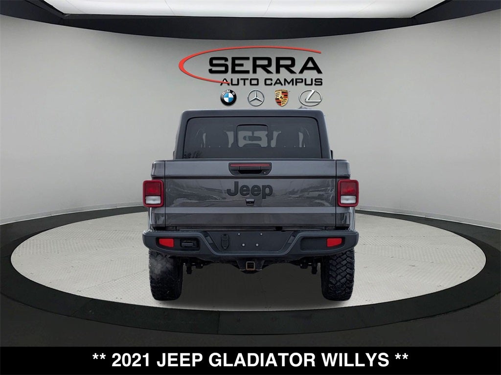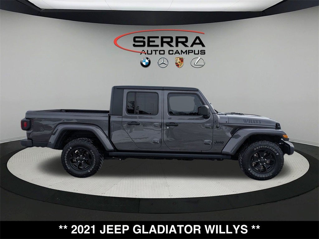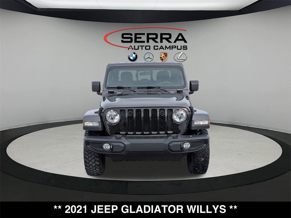 Welcome to the Serra Auto Campus, whether you are looking for a new or pre-owned BMW, Mercedes-Benz or Porsche car, or SUV you will find it here. We have helped many customers from Alma, Ann Arbor, Charlotte, East Lansing, Eaton Rapids, Flint, Grand Blanc, Fenton, Holt, Howell, Jackson, Lansing, Mason, Okemos, Owosso, Mt. Pleasant, Saginaw, Midland, Jackson and Kalamazoo find the BMW, Mercedes-Benz or Porsche of their dreams! Priced below KBB Fair Purchase Price! Odometer is 19963 miles below market average! Granite Crystal Metallic Clearcoat 2021 Jeep Gladiator 4D Crew Cab Willys 4WD 8-Speed Automatic 3.6L V6 24V VVT