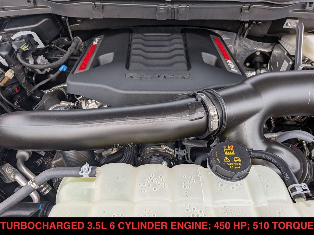 F-150 Raptor, 4D SuperCrew, 3.5L V6 EcoBoost, 10-Speed Automatic, 4WD, Gray Metallic, Black Leather, 14 Speakers, Adjustable pedals, Auto High-beam Headlights, Auto tilt-away steering wheel, Auto-dimming door mirrors, Auto-dimming Rear-View mirror, Automatic temperature control, Brake assist, Bumpers: body-color, Carbon Fiber Interior Appliques, Dual Valve Shocks, Electronic Stability Control, Emergency communication system: SYNC 4 911 Assist, Equipment Group 802A Raptor 37, Front Bucket Seats, Front fog lights, Fully automatic headlights, Garage door transmitter, Hard Folding Tonneau Pickup Box Cover, Heads-Up Display, Heated door mirrors, Heated front seats, Heated rear seats, Heated steering wheel, Illuminated entry, Internet access capable: FordPass Connect 5G, Lane Departure Warning System, Leather steering wheel, Leather Trimmed Seats, Low tire pressure warning, Modular Front Bumper, Navigation system: Connected Navigation, Outside temperature display, Pedal memory, Radio: B&O Unleashed Sound System by Bang & Olufsen, Rain sensing wipers, RECARO Alcantara Suede Front Seats, Remote keyless entry, Security system, Speed-sensing steering, Steering wheel memory, Steering wheel mounted audio controls, SYNC 4 w/Enhanced Voice Recognition, Telescoping steering wheel, Tough Bed Spray-In Bedliner, Turn signal indicator mirrors, Ventilated front seats, Wheels: Raptor 37 Unique 17 Cast Aluminum.